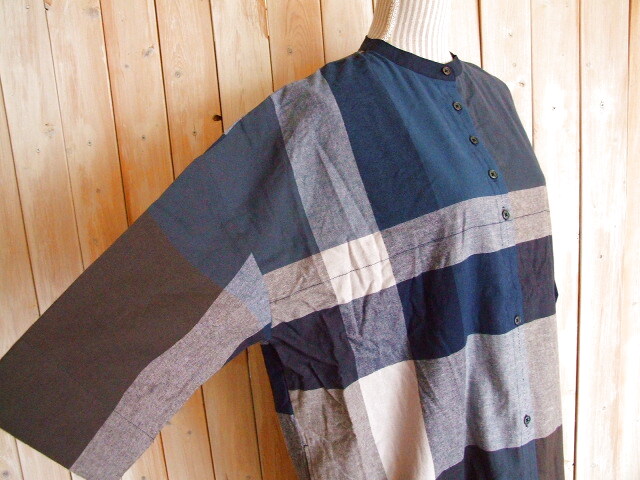 大柄チェック、前ボタンのバンドカラーワンピース。